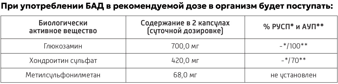 Глюкозамин и хондроитин являются естественными компонентами суставного хряща. Они способствуют синтезу коллагена и веществ, необходимых поддержанию эластичности и устойчивости хрящей и суставов к внешним воздействиям. Нормализуют отложения кальция в суставах, снижают риск развития остеопороза. Стимулируют процессы заживления и подавляют активность ферментов, разрушающих хрящевую ткань. Проявляют антиоксидантные свойства, способствуя замедлению процессов старения. Улучшают подвижность суставов и позвоночника.
