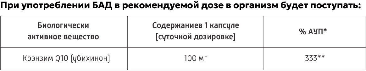 Коэнзим Q10 выполняет антиоксидантную защиту и обеспечивает энергией все клетки тела. Он улучшает работу сердца, общее самочувствие и иммунитет, регулирует обмен липидов, нормализует вес за счет ускорения обменных процессов.